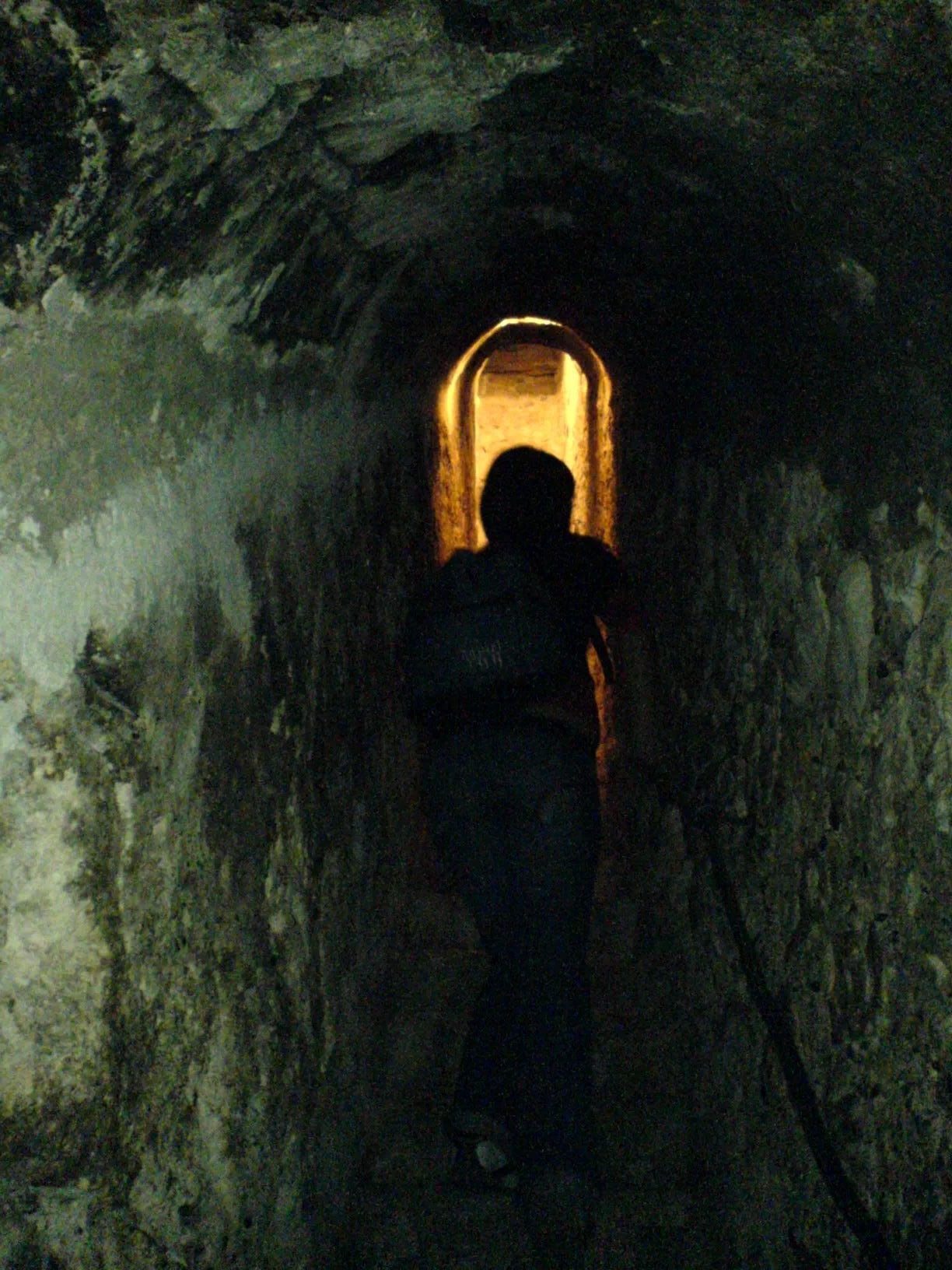 O pár chvil později jsme konečně dorazili k něčemu, co připomínalo vchod, ale bez dveří. Jen úzká klenba odbočující doleva, a konečně nahoru.